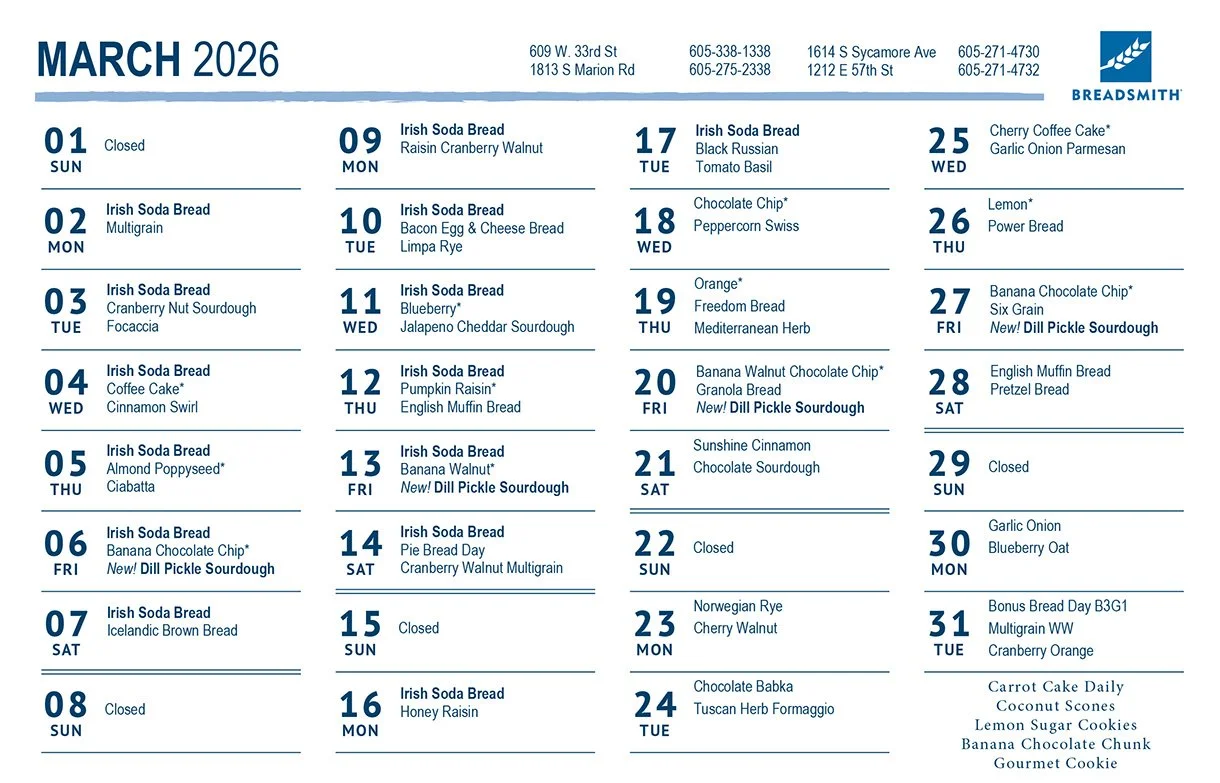 February’s sweet treats - are available daily at all four Sioux Falls Breadsmith locations. The Gourmet Cookie is Turtle, the Everyday Cookie is Chocolate Sugar, our Seasonal Scone is Chocolate Almond, and our Everyday Dessert Bread is Raspberry White Chocolate Dessert Bread.